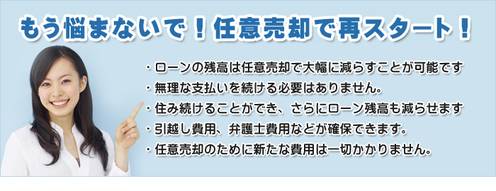 任意売却とは、債務者(一般的に売主のこと)がローンを支払えなくなった場合に、住宅ローンなどの融資を受けている人と各金融機関との合意に基づいて適正価格にて、自宅などの不動産を売却することです。万が一、競売になってしまうと所有者の意志には関係なく強制的に売却処分されますが、「任意売却」は所有者の意志で売買することが可能です。任意売却の費用